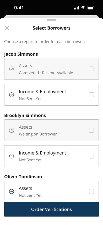 Loan Officers can order verifications à la carte. Choosing which borrowers to verify, which reports to run, and when. Allowing them to control verification spend without slowing underwriting.