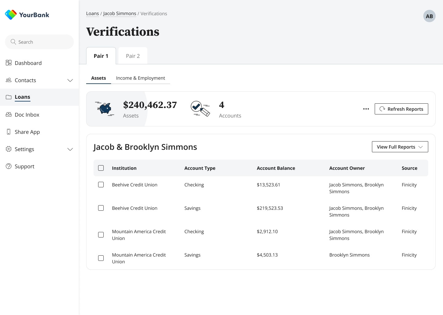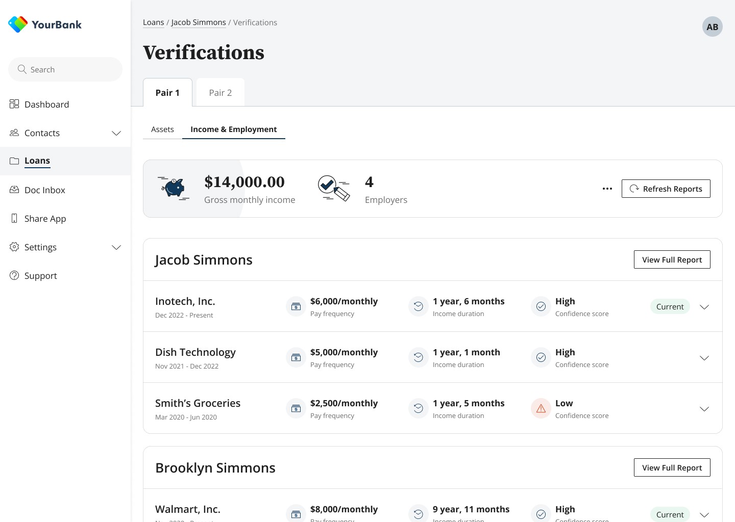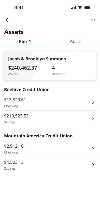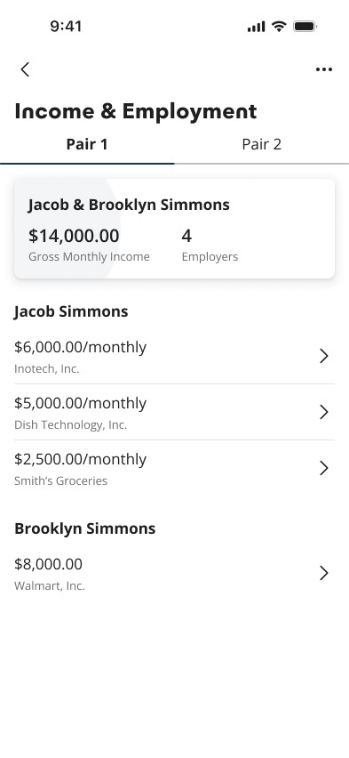 Enabled lenders to confidently support complex borrower structures without workarounds or downstream risk. Multi-borrower workflows made it possible to verify, attribute, and evaluate assets and employment across multiple borrower pairs within a single loan, reducing operational friction and improving underwriting clarity for loans involving co-buyers, non-occupant co-borrowers, and family support.