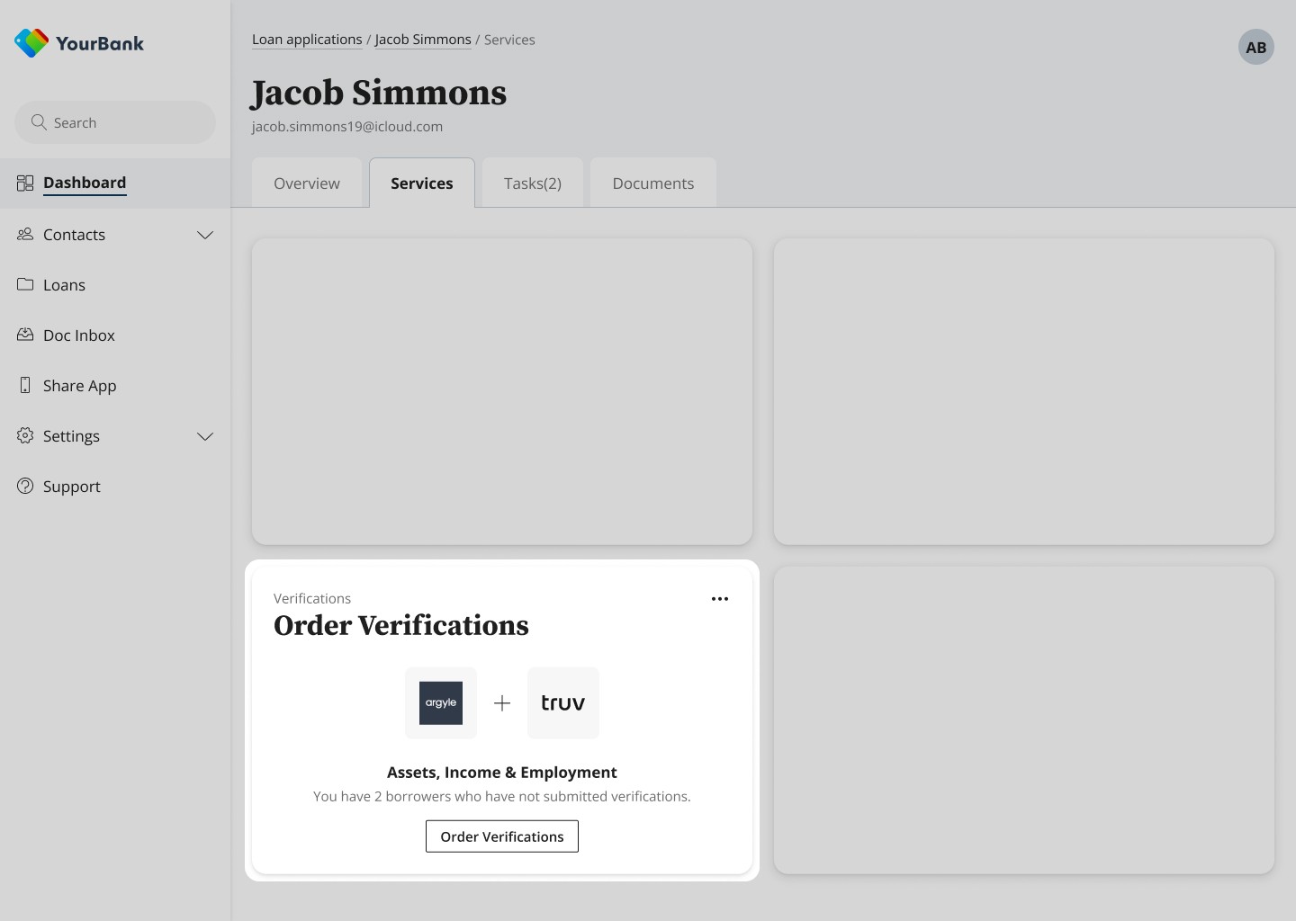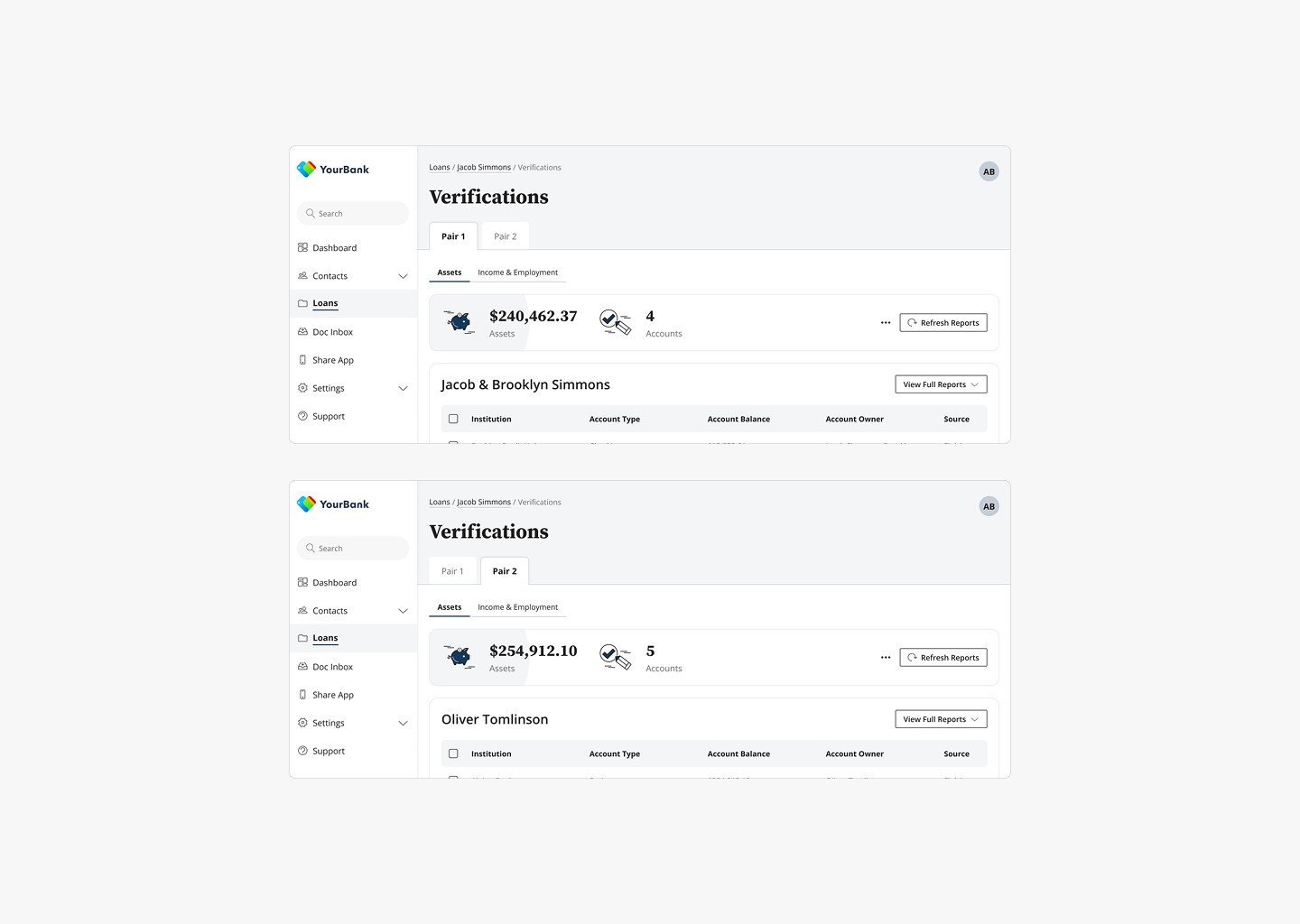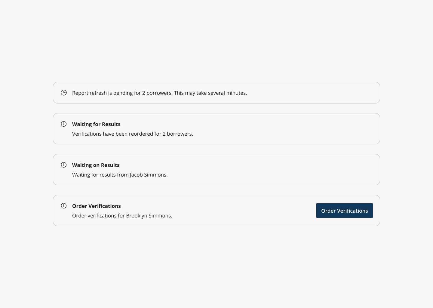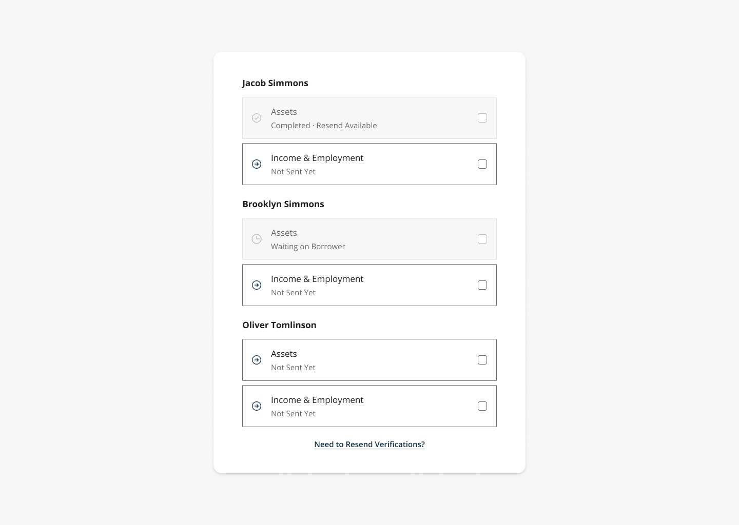 Managing verifications across multiple borrowers introduces a wide range of states, including who has been invited, who has completed their verifications, where results are pending, and when re-ordering is required. Making these states clear and actionable for Loan Officers was critical to preventing underwriting delays and avoiding confusion.