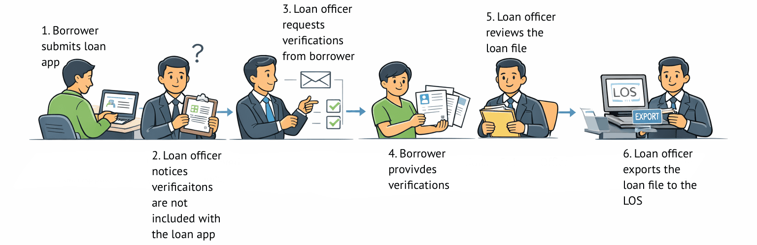 To reduce friction and increase completion rates, borrowers typically submit a streamlined loan application that excludes verifications, either by design or because optional steps are skipped to apply quickly. The loan officer receives this lightweight application and then initiates a separate request for required verifications—such as assets, income, and employment—at the appropriate point in the workflow. The borrower submits these verifications asynchronously, allowing the loan officer to review them alongside the application, validate the borrower’s financial profile, and resolve any gaps. Once the loan is verification-complete, the loan officer exports the file into the loan origination system (LOS) to move it confidently into underwriting and toward closing.